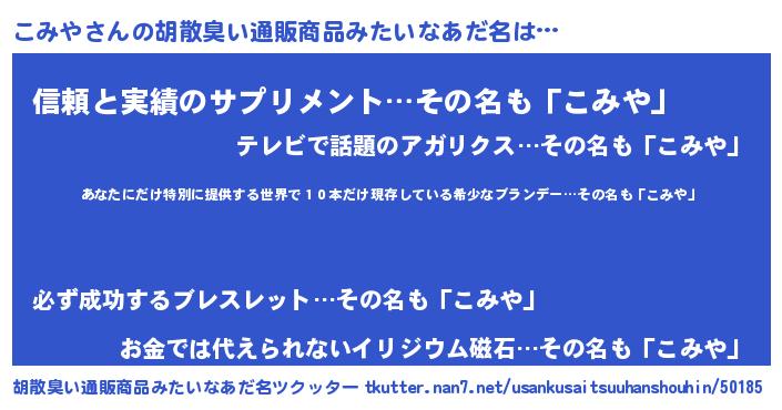 | 意味不明あだ名 | 『住所不定無職こみや(71歳)』『自称こみや』 |