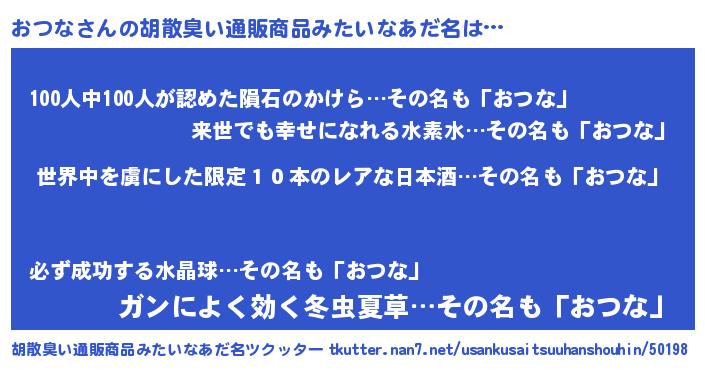 | 意味不明あだ名 | 『住所不定無職おつな(56歳)』『自称おつな』 |