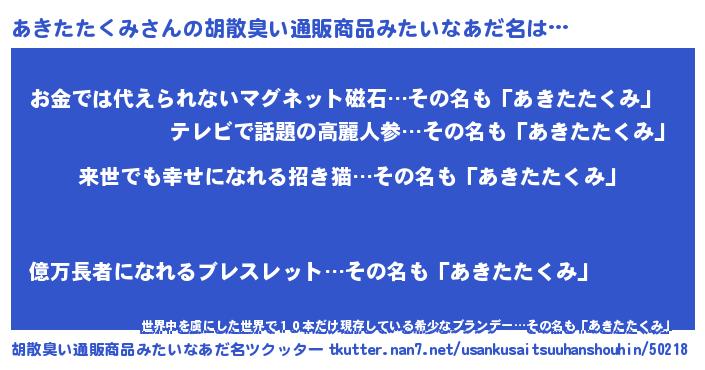 | 伝説のあだ名 | 『古より伝わる吟遊詩人あきたたくみ』 |