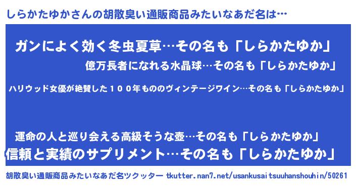 | 意味不明あだ名 | 『住所不定無職しらかたゆか(4歳)』 |