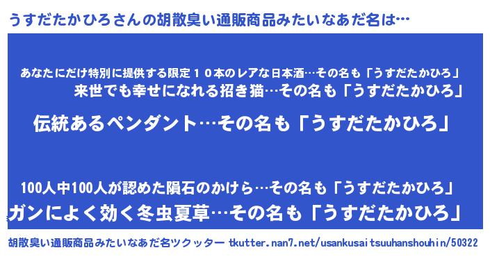 | 意味不明あだ名 | 『とにかく怪しいうすだたかひろ』 |
