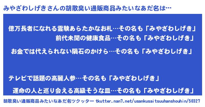 | 男性向けラノベタイトル風あだ名 | 『ノーゲーム・ノーミヤザワシゲキ』 |