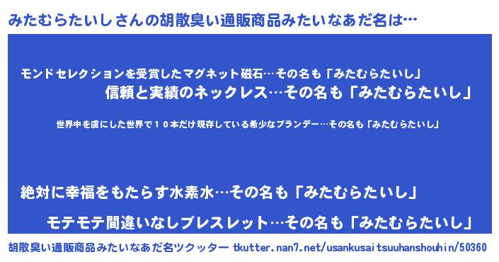 | 意味不明あだ名 | 『住所不定無職みたむらたいし(98歳)』 |