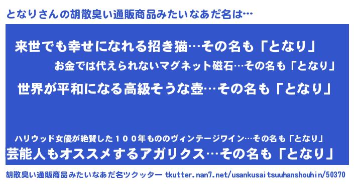 | 意味不明あだ名 | 『となりフォーエバー』『永久保存となり』 |
