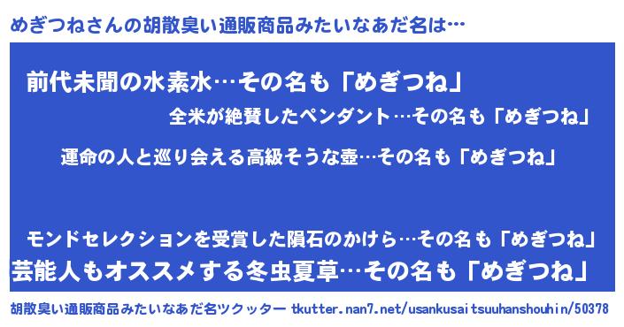 | 意味不明あだ名 | 『めぎつねフォーエバー』『自称めぎつね』 |