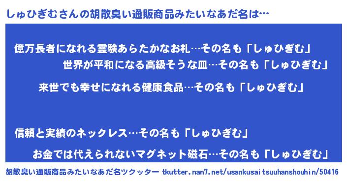 | ヘコむあだ名 | 『しゅひぎむ(爆)』『しゅっふぃ~』 |