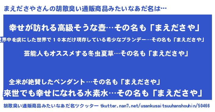 | 男性向けラノベタイトル風あだ名 | 『Re:まえださやから始める異世界生活』 |
