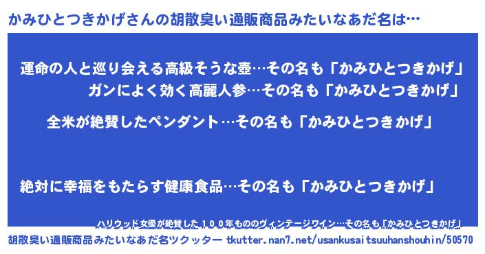 | 男性向けラノベタイトル風あだ名 | 『かみひとつきかげに滅ぼされるだけの簡単なお仕事です』 |