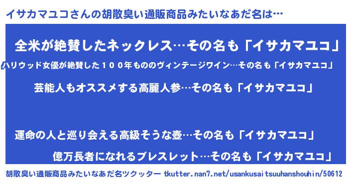 | 男性向けラノベタイトル風あだ名 | 『イサカマユコ~年齢イコール彼女いない歴の魔法使い~』 |