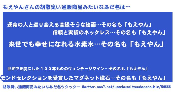 | ヘコむあだ名 | 『もえやん(震え声)』『レバニラ』 |