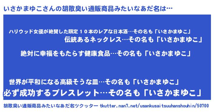 | ヘコむあだ名 | 『いさかまゆこ(笑)』『いさもー』 |