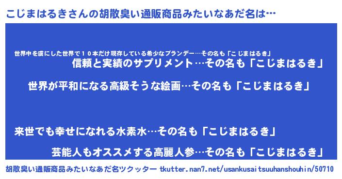 | 男性向けラノベタイトル風あだ名 | 『やはりこじまはるきの青春ラブコメはまちがっている 』 |