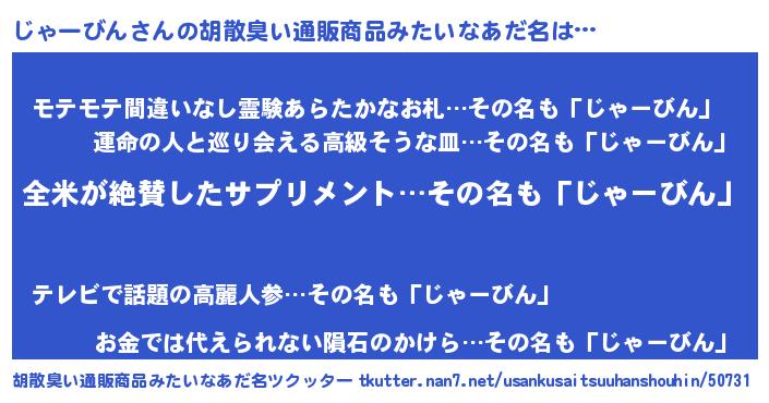 | 男性向けラノベタイトル風あだ名 | 『じゃーびんの嫁は女の子じゃないと思った?』 |