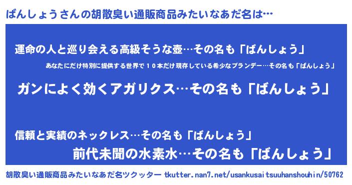 | 意味不明あだ名 | 『自称ばんしょう』『永久保存ばんしょう』 |