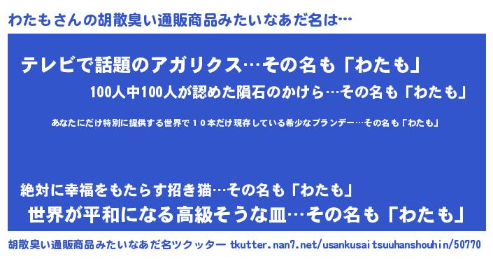 | 意味不明あだ名 | 『ヨモギ科わたも属』『自称わたも』 |