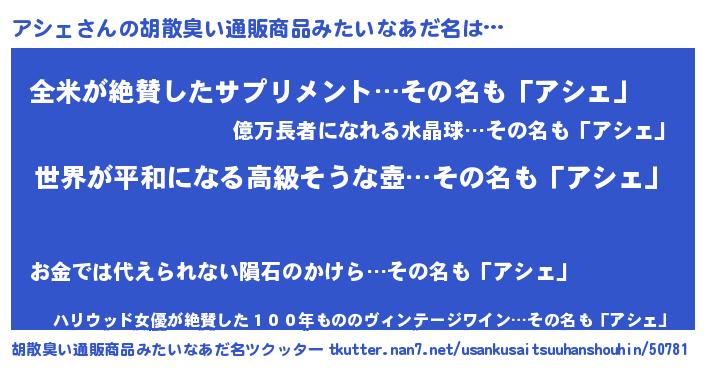 | 欧米人風あだ名 | 『アシェクリステル』『ウサインアシェ』 |