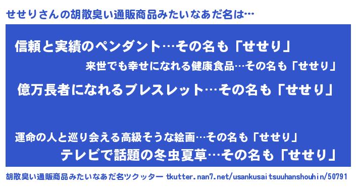 | 意味不明あだ名 | 『ペロリンせせり』『自称せせり』 |