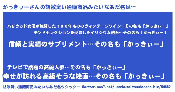 | 男性向けラノベタイトル風あだ名 | 『ダンジョンにかっきぃーを求めるのは間違っているだろうか』 |