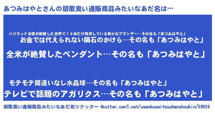 | 意味不明あだ名 | 『とにかく怪しいあつみはやと』 |