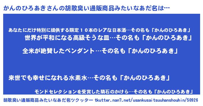 | 男性向けラノベタイトル風あだ名 | 『かんのひろあきに滅ぼされるだけの簡単なお仕事です』 |