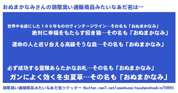 | 男性向けラノベタイトル風あだ名 | 『うちのおぬまかなみが世界を掌握している!』 |