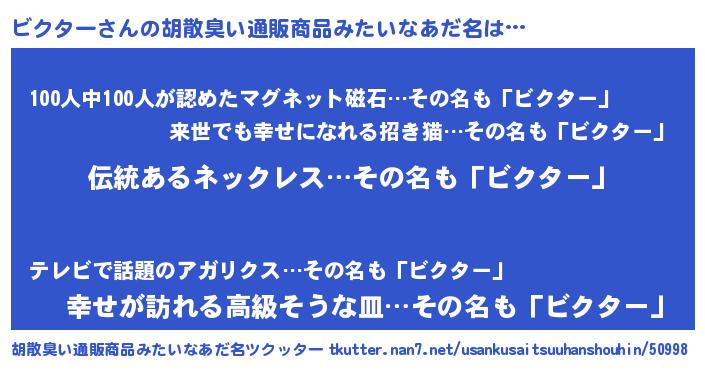 | 男性向けラノベタイトル風あだ名 | 『ビクターに滅ぼされるだけの簡単なお仕事です』 |