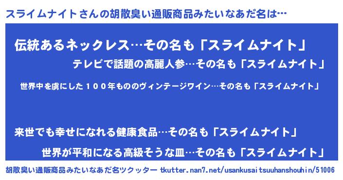 | 意味不明あだ名 | 『住所不定無職スライムナイト(13歳)』 |