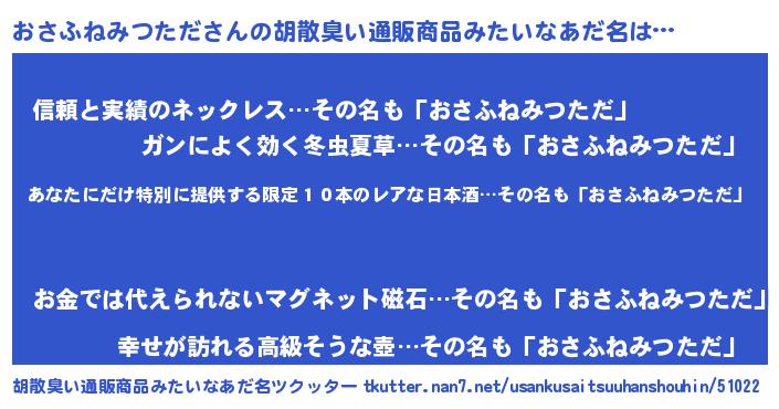 | 男性向けラノベタイトル風あだ名 | 『おさふねみつただに滅ぼされるだけの簡単なお仕事です』 |