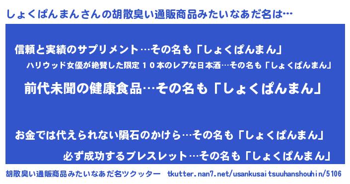 | 男性向けラノベタイトル風あだ名 | 『しょくぱんまん~年齢イコール彼女いない歴の魔法使い~』 |