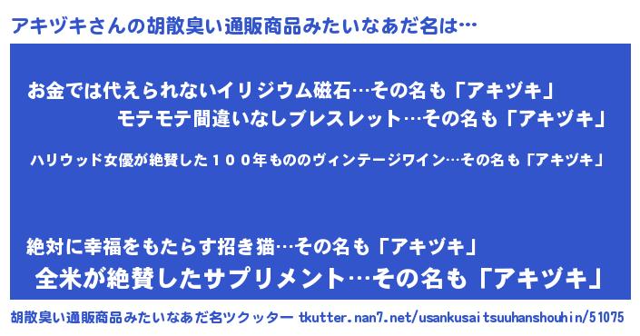 | 意味不明あだ名 | 『住所不定無職アキヅキ(13歳)』 |