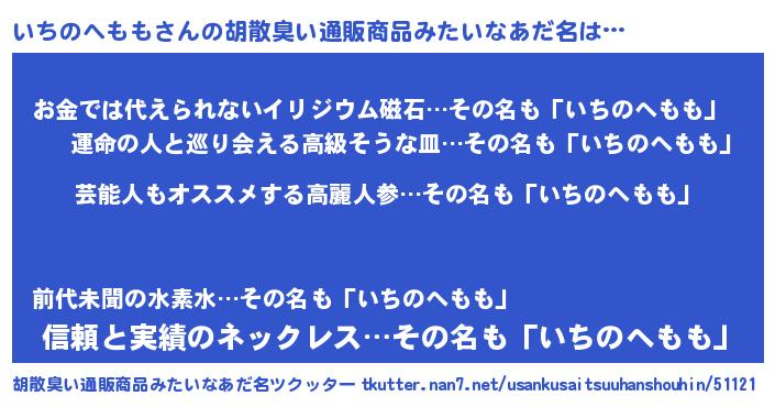 | 男性向けラノベタイトル風あだ名 | 『Re:いちのへももから始める異世界生活』 |