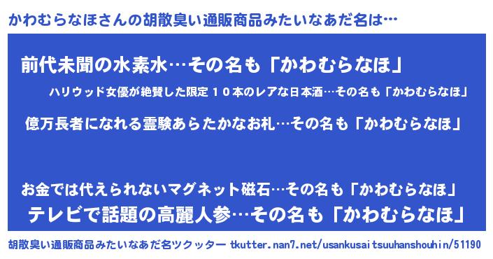 | ヘコむあだ名 | 『かわっふぃ~』『かわむらなほ(遠い目)』 |