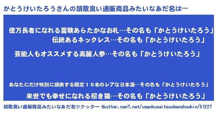 | ヘコむあだ名 | 『かとにー』『かとうけいたろう(笑)』 |