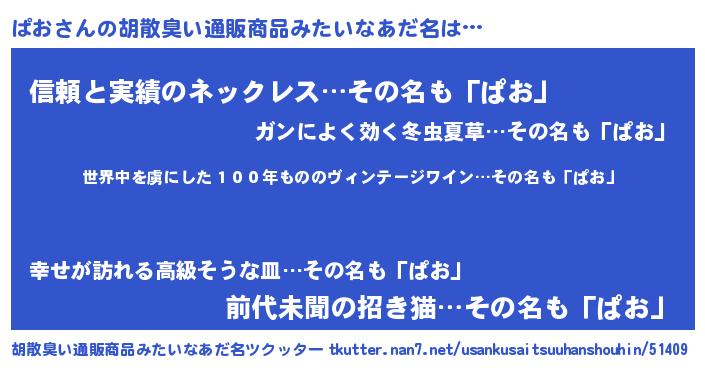 | 意味不明あだ名 | 『住所不定無職ぱお(12歳)』『永久保存ぱお』 |