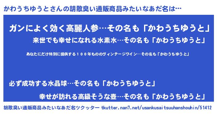 | 意味不明あだ名 | 『住所不定無職かわうちゆうと(2歳)』 |