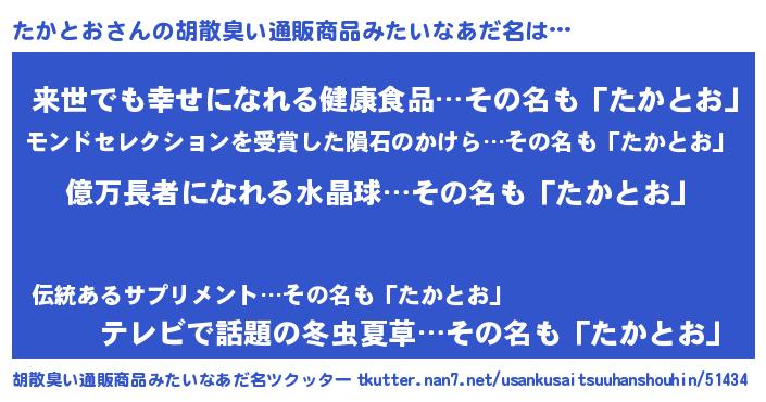 | 意味不明あだ名 | 『ペロリンたかとお』『永久保存たかとお』 |