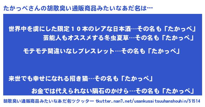 | 意味不明あだ名 | 『ペロリンたかっぺ』『自称たかっぺ』 |