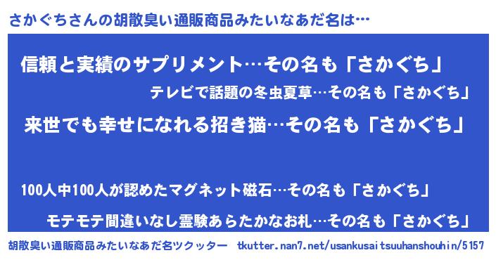 | ヘコむあだ名 | 『さかぐち(笑)』『さか太郎』『豆乳』 |