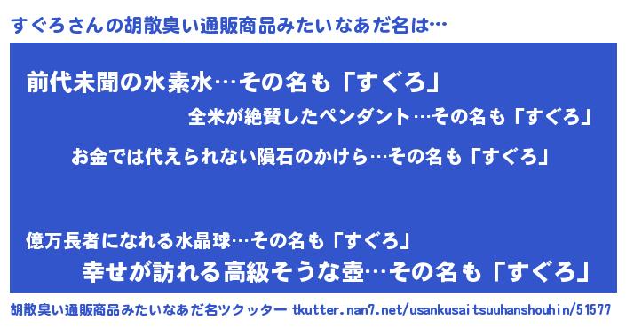 | 男性向けラノベタイトル風あだ名 | 『すぐろに滅ぼされるだけの簡単なお仕事です』 |