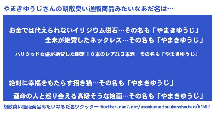 | 意味不明あだ名 | 『住所不定無職やまきゆうじ(43歳)』 |