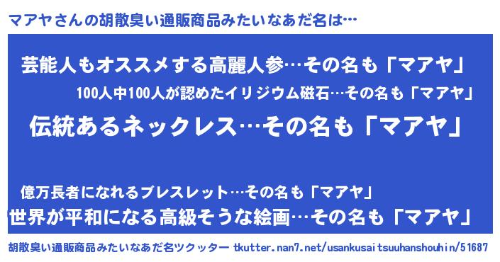 | 意味不明あだ名 | 『とにかく怪しいマアヤ』『自称マアヤ』 |