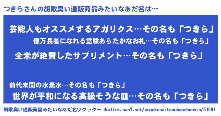 | 意味不明あだ名 | 『とにかく怪しいつきら』『自称つきら』 |
