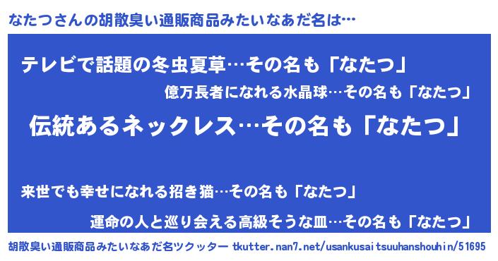 | 意味不明あだ名 | 『とにかく怪しいなたつ』『自称なたつ』 |