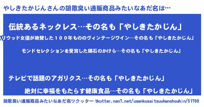 | ヘコむあだ名 | 『やしっぺ』『やしきたかじん(苦笑)』 |