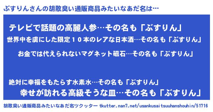 | 男性向けラノベタイトル風あだ名 | 『おまえをオタクにしてやるから、俺をぶすりんにしてくれ! 』 |