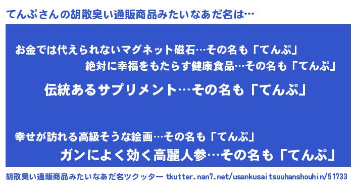 | 意味不明あだ名 | 『とにかく怪しいてんぷ』『自称てんぷ』 |