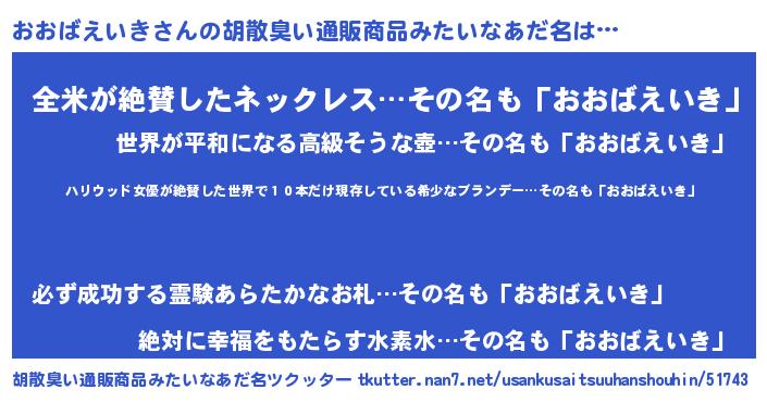 | 意味不明あだ名 | 『住所不定無職おおばえいき(79歳)』 |