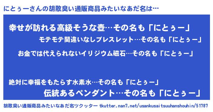 | ヘコむあだ名 | 『豆乳』『にとっぺ』『にともー』 |