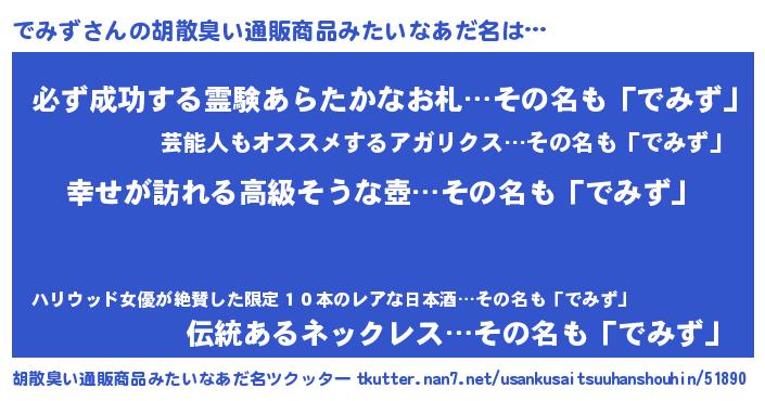 | 女子向けラノベタイトル風あだ名 | 『でみずの雑貨屋さん』『闇のでみず』 |