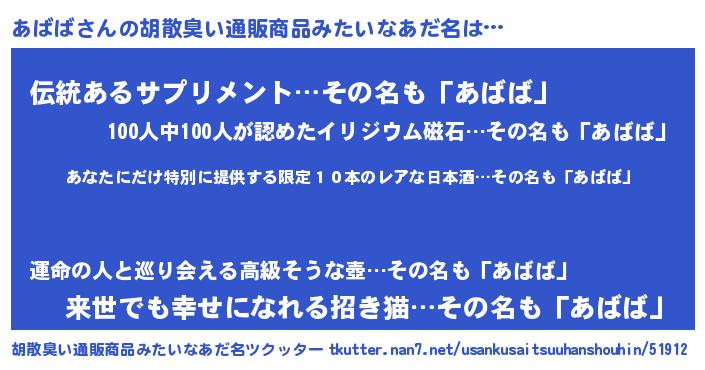 | 意味不明あだ名 | 『住所不定無職あばば(59歳)』 |